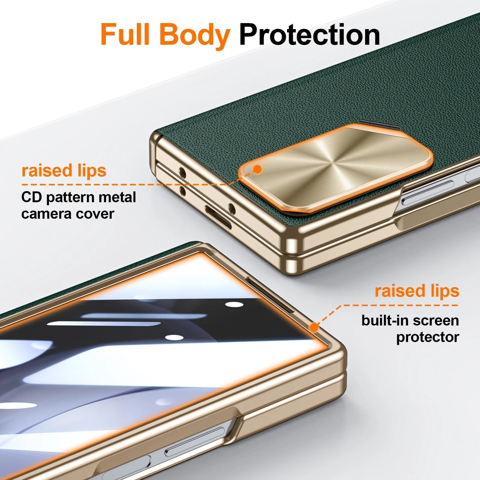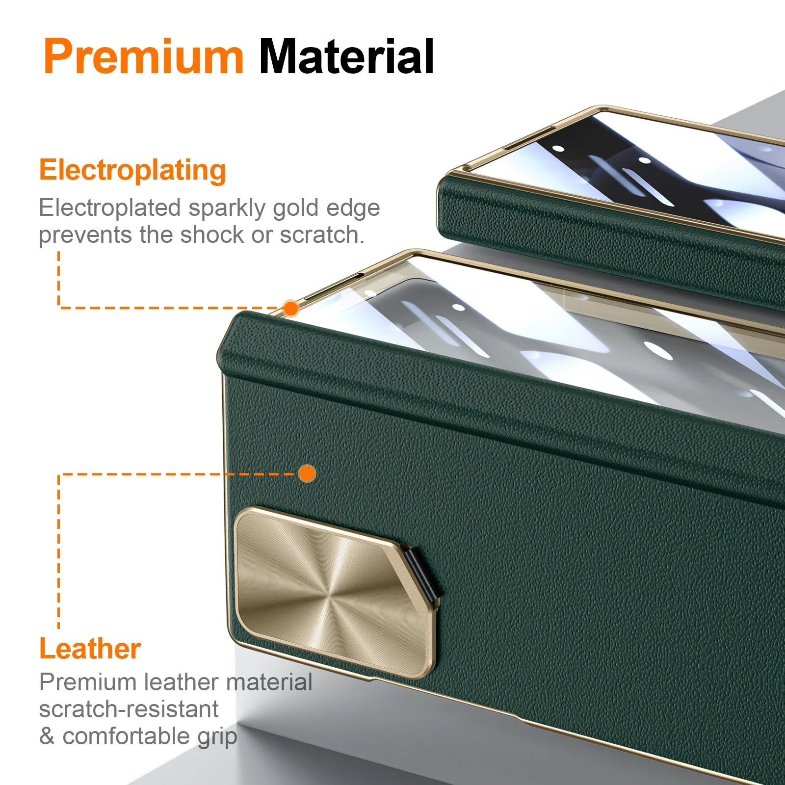 The Opus® - Leather Armor Magnetic Hinge Case brings a touch of elegance with genuine leather and electroplating accents. Featuring hinge protection and a magnetic closure, this case combines style and security for your Galaxy Z Fold 7 while keeping your device slim and accessible.